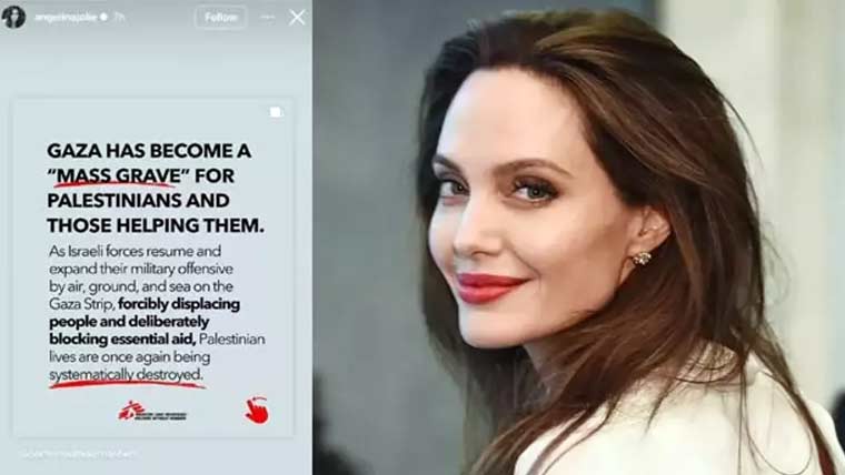 عالمی شہرت یافتہ اداکارہ اور اقوامِ متحدہ کی سابق خصوصی سفیر انجلینا جولی نے ہفتے کے روز غزہ کے عوام سے یکجہتی کا ایک مضبوط پیغام دیا، انجلینا جولی کے بیان پر انتہا پسند یہودیوں کی جانب سے غم و غصے کا اظہار کیا جارہا ہے۔اداکارہ نے انسٹاگرام اسٹوری میں ڈاکٹرز وِد آؤٹ بارڈرز (میڈیسن فرنٹیئرز) کی ایک دل دہلا دینے والی رپورٹ شیئر کی، جس میں غزہ کو "فلسطینیوں اور ان کی مدد کرنے والوں کےلیے ایک اجتماعی قبر” قرار دیا گیا ہے۔